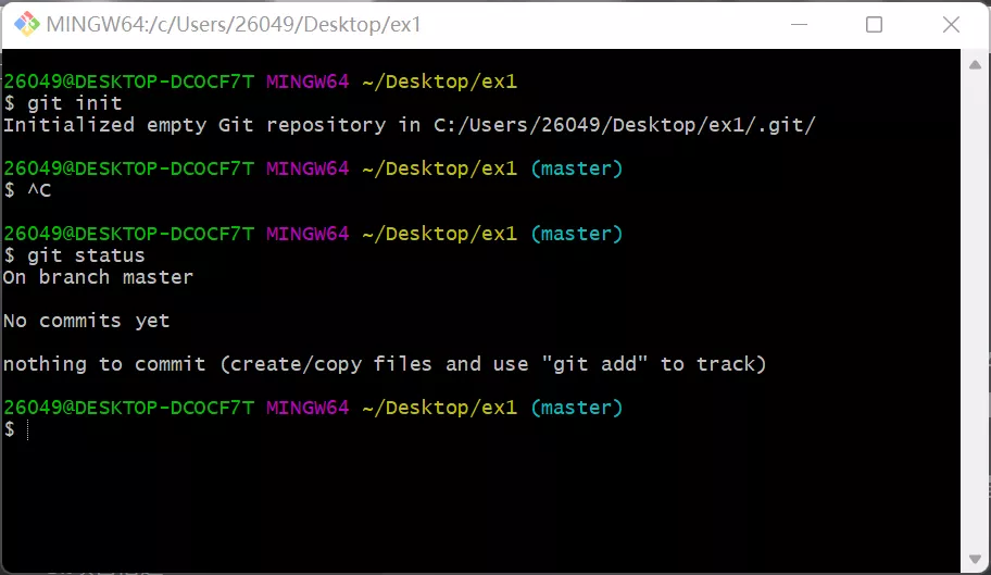 我们采用本地初始化仓库的方式,首先在电脑桌面上新建文件夹ex1,然后右键该文件夹进行git bash