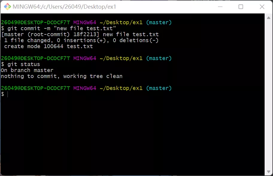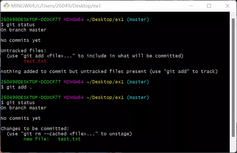 下面我们举一个完整的案例,就是将一个空的文件夹初始化成一个git仓库,然后新建一个test.txt文件并将其加入到仓库中的整个过程。